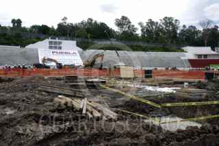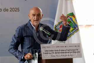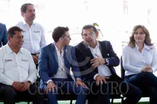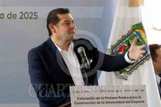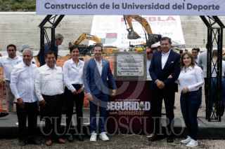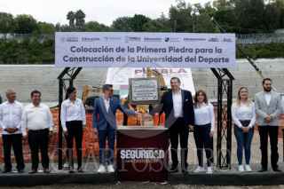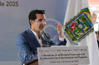 PUEBLA, PUEBLA, 24 de julio de 2025.- El gobernador del estado, Alejandro Armenta, acompañado por el director de la CONADE, Rommel Pacheco, encabezó la colocación de la primera piedra para la construcción de la Universidad del Deporte, en el Estadio Olímpico Ignacio Zaragoza. FOTO: MIREYA NOVO /CUARTOSCURO.COM