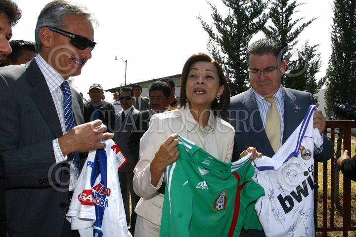 MÉXICO, D.F. 14NOVIEMBRE2007.- La secretaria de educación pública, Josefina Vasquez Mota firmó un convenio con el Club de futbol Real Madrid, en una escuela en Iztapalapa, donde llegó en helicóptero. FOTO:PAOLA HIDALGO/CUARTOSCURO.COM
