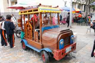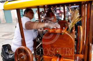 BOGOTÁ, COLOMBIA, 25JULIO2025.- En el centro de esta capital se elabora el jugo de caña al momento con este trapiche colocado en un carro de madera que funciona con un motor. FOTO MARCELO PALACIOS/CUARTOSCURO.COM