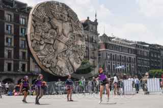 CIUDAD DE MÉXICO, 25JULIO2025.- Un grupo de mujeres en un juego de pelota mesoamericano "El tlachtli" a un costado de una réplica de la escultura de "Coyolxauhqui" (diosa lunar en la mitología mexica) que se encuentra en la plancha del zócalo capitalino en el marco de la conmemoración de los 700 años de la fundación de México-Tenochtitlán. FOTO: MARIO JASSO/CUARTOSCURO.COM