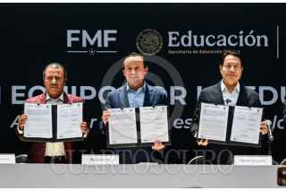 TOLUCA, ESTADO DE MÉXICO, 25JULIO2025.- Armando Contreras Castillo, Director General del INEA; Mikel Arriola Peñalosa Presidente de la Federación Mexicana de Fútbol, y Mario Delgado Carrillo, Secretario de Educación Pública, muestran la firma de convenio de colaboración contra el Analfabetismo, entre la Secretaría de Educación Pública (SEP), el Instituto Nacional para la Educación de los Adultos (INEA) y la Federación Mexicana de Fútbol (FMF). El objetivo de este convenio es promover la alfabetización, la educación primaria y secundaria entre personas trabajadoras de la FMF, sus familias, futbolistas, aficionados y público en general de 15 años o más que no sepan leer ni escribir o no hayan terminado estos niveles educativos. Esta campaña se espera llegar a todo el país y lograr el objetivo de tener el 4?Analfabetismo y levantar Bandera Blanca en México. FOTO: CARLOS MARURI/CUARTOSCURO.COM