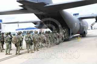 SANTA LUCÍA, ESTADO DE MÉXICO, 28JULIO2025.- 90 efectivos de Fuerzas Especiales del Ejército Mexicano abordaron una aeronave modelo Hércules en la Base Militar de Santa Lucia rumbo a Culiacán para reforzar la Estrategia Nacional de Seguridad. Estos efectivos se suman a las unidades de Fuerzas Especiales y de Fusileros Paracaidistas que el pasado 22 y 23 de julio de 2025, se incorporaron al despliegue operativo de la 9/a. Zona Militar en esa entidad. FOTO: SEDENA/CUARTOSCURO.COM