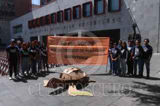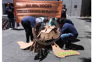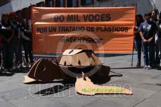 CIUDAD DE MÉXICO, 29JULIO2025.- Voluntarios de Greenpeace se manifestaron afuera de la Secretaría de Relaciones Exteriores en donde anunciaron la recaudación de las 90 mil firmas para que se ponga en marcha el Tratado Global de Plásticos, que busca abordar la contaminación plástica, incluyendo su impacto en el medio marino. FOTO: GRACIELA LÓPEZ/CUARTOSCURO.COM
