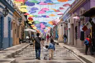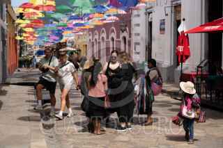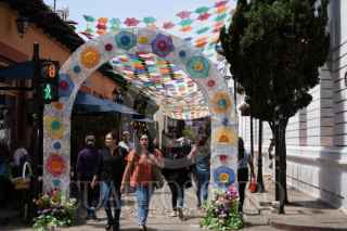 SAN CRISTÓBAL DE LAS CASAS, CHIAPAS, 29JULIO2025.- Turistas y pobladores de la región caminan sobre el Andador del Carmen recientemente decorado con piezas de crochet realizado por más de 50 mujeres en colaboración con del DIF local. FOTO: ISABEL MATEOS HINOJOSA /CUARTOSCURO.COM