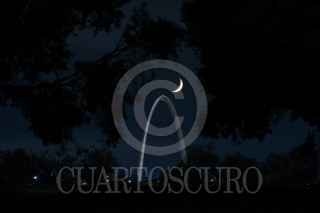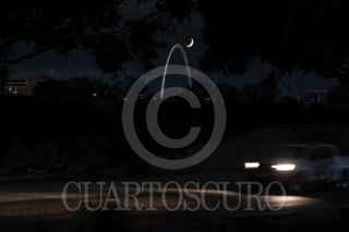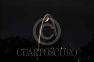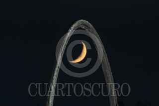 TIJUANA, BAJA CALIFORNIA, 30JULIO2025.-La luna en fase creciente se observó durante la noche detrás del arco del Reloj Monumental, en el centro de Tijuana. El fenómeno fue visible por algunos minutos, justo antes de que la luna descendiera en el horizonte. FOTO: OMAR MARTÍNEZ/ CUARTOSCURO.COM