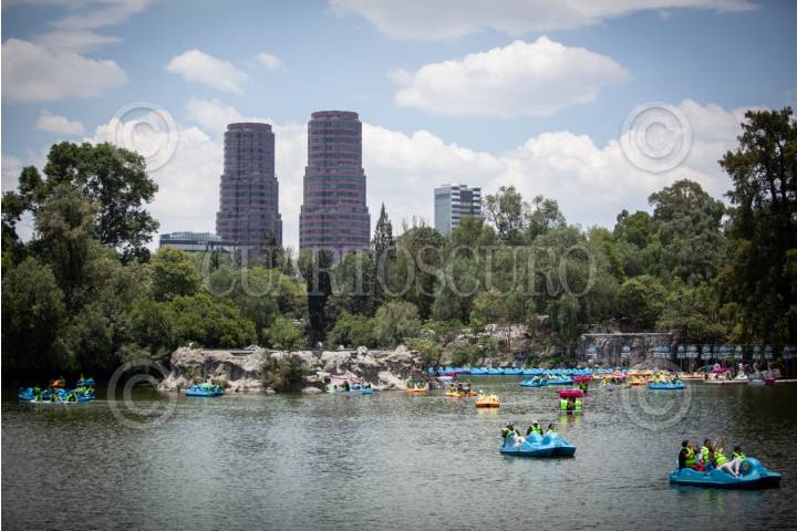 CIUDAD DE MÉXICO, 30JULIO2025.- Turistas disfrutan una tarde soleada en Chapultepec con changos de colores y sombrilla para protegerse. En la imagen panorámica de una de las atracciones en el lago de Chapultepec. FOTO: ANDREA MURCIA /CUARTOSCURO.COM