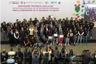 CIUDAD DE MÉXICO 01AGOSTO2025.- Clara Brugada, jefa de gobierno y Pablo Vázquez, titular de la Secretaria de Seguridad Ciudadana, encabezaron la Ceremonia de Graduación Reconecta con la Paz, estrategia integral de intervención temprana para la prevención de la violencia y el delito. FOTO:ROGELIO MORALES /CUARTOSCURO.COM