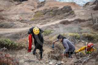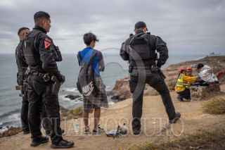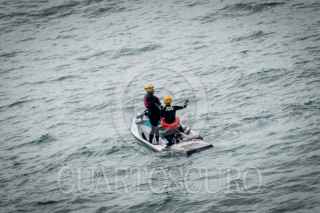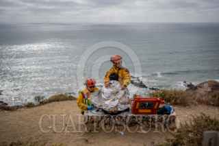 TIJUANA BAJA CALIFORNIA 1AGOSTO2025.-Un joven de aproximadamente 22 años fue rescatado por la unidad de rescate acuático de Bomberos Tijuana, luego de caer al mar desde un acantilado en la zona del mirador La Joya mientras pescaba. Al llegar al sitio, los rescatistas lo encontraron sobre una roca, luchando por no ser arrastrado por las olas. En el operativo participaron 10 bomberos, 5 salvavidas y 2 rescatistas en moto acuática. El hombre fue valorado por paramédicos de la Cruz Roja, sin requerir traslado hospitalario. FOTO CHRIS NOYOLA / CUARTOSCURO.COM