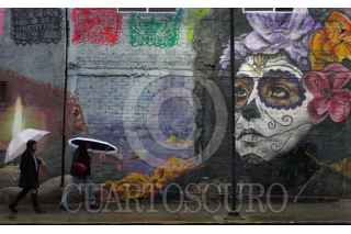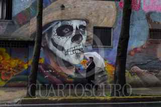 CIUDAD DE MÉXICO, 02AGOSTO2025.- Un hombre con paraguas en mano, camina frente a un mural alusivo al Día de Muertos en la alcaldía Magdalena Contreras. FOTO: ROGELIO MORALES /CUARTOSCURO.COM