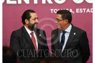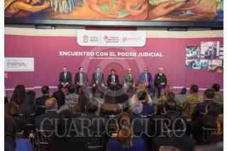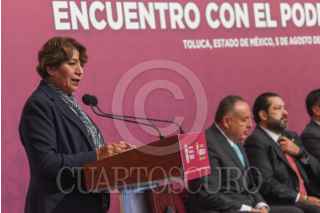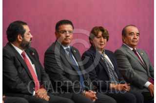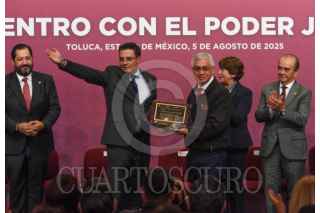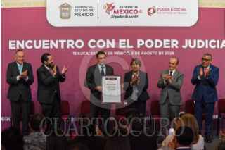 TOLUCA, ESTADO DE MÉXICO, 05AGOSTO2025.- Delfina Gómez Álvarez, Gobernadora del Estado de México sostuvo un encuentro con integrantes del Poder Judicial del Estado d México, magistradas y magistrados que concluyen se periodo y los electos el pasado 1 de junio, acompañada por Fernando Díaz Juárez, Magistrado Presidente del PJEM, José Luis Cervantes Titular de la FGJEM, Maurilio Hernández, presidente de la Diputación Permanente, Horacio Duarte, Secretario General de Gobierno, Cristóbal Castañeda, Secretario de Seguridad estatal, Francisco Vázquez, Presidente de la Junta de Coordinación Política de la Cámara de LXII Legislatura local. FOTO: CRISANTA ESPINOSA AGUILAR/CUARTOSCURO.COM