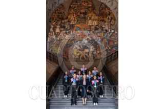 CIUDAD DE MÉXICO, 05AGOSTO2025.- Claudia Sheinbaum Pardo, Presidenta de México, se toma foto con los.medallitas del Campeonato del Mundo de Deportes Acuáticos realizado en Singapur, en donde destacó la actuación de Osmar Olvera. La foto se dio en las escaleras del Palacio Nacional. FOTO: PRESIDENCIA/CUARTOSCURO.COM