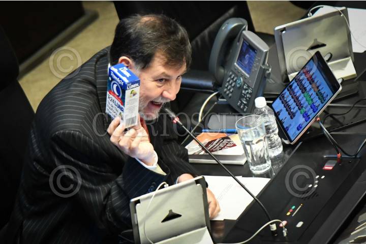 CIUDAD DE MÉXICO, 06AGOSTO2025.- Gerardo Fernández Noroña, presidente de la mesa directiva, manda una caja de té de tila a Ricardo Anaya, senador de Morena, luego de que lo acusara de dejar vacía la primer caja que le envío, esto durante la sesión ordinaria de la Comisión Permanente del Congreso de la Unión, en donde se discute el dictamen que ratifica a Claudia Pavlovich, embajadora de México en Panamá y Francisco Javier Díaz de León, embajador de México ante Turquía. Además de la discusión del punto de acuerdo que exhorta al senador Adán Augusto López Hernández, solicite licencia inmediata a su cargo y se separe de toda función parlamentaria, a fin de ponerse a disposición de las autoridades competentes y enfrentar las denuncias y señalamientos en su contra por el caso de Hernán Bermúdez Requena, ex secretario de Seguridad de Tabasco quien ha sido vinculado como presunto líder de "La Barredora". FOTO: MARIO JASSO/CUARTOSCURO.COM