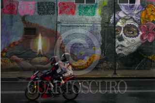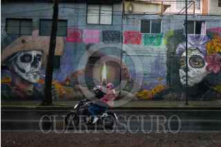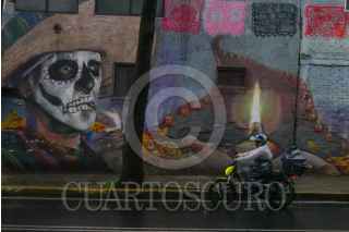 CIUDAD DE MÉXICO, 06AGOSTO2025.- En la ciudad de México cada semana mueren cerca de 5 motociclistas en accidentes viales, esto según datos de la Secretaría de Movilidad (Semovi) en su último Reporte Trimestral de Hechos de Tránsito del año pasado. En imagen aspectos de motociclistas frente a un mural alusivo a la celebración de Día de Muertos. FOTO: ROGELIO MORALES /CUARTOSCURO.COM