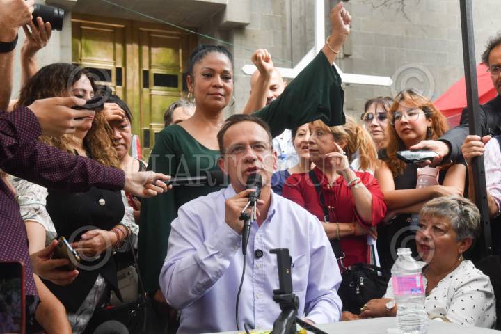 CIUDAD DE MÉXICO, 08AGOSTO2025.- Israel Vallarta, ofreció conferencia frente a las instalaciones de la Suprema Corte de Justicia de la Nación (SCJN) en la que en compañía de sus esposa Mary Sainz, recalcó que solicitará a las instituciones correspondientes se haga justicia por su caso luego de pasar 20 años en prisión si recibir sentencia por el presunto cargo de secuestro. FOTO: MARIO JASSO/CUARTOSCURO.COM