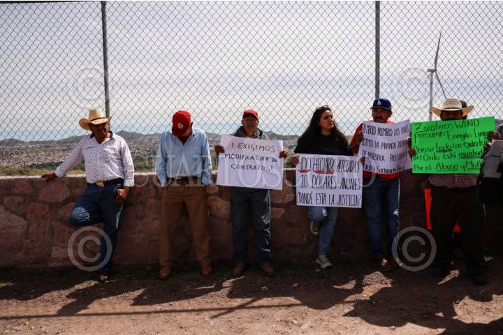 ZACATECAS, ZACATECAS, 08AGOSTO2025.- Ejidatarios de la comunidad de El Orito realizaron una manifestación y plantón frente a las instalaciones de la empresa eólica Zacatecas Wind. Señalaron que sus predios, que abarcan alrededor de 660 hectáreas afectadas por caminos y aerogeneradores, están incluidos en un contrato de arrendamiento que, según dijeron, fue modificado por la empresa, dejando sin beneficio a la mayoría. Indicaron que, aunque fueron citados días atrás por la Procuraduría Agraria para dialogar, la empresa no acudió. FOTO: ADOLFO VLADIMIR /CUARTOSCURO.COM