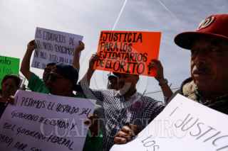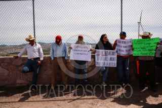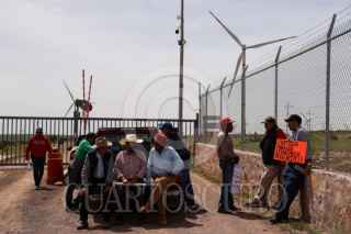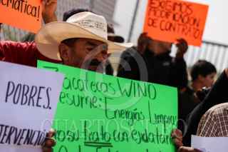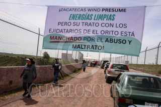 ZACATECAS, ZACATECAS, 08AGOSTO2025.- Ejidatarios de la comunidad de El Orito realizaron una manifestación y plantón frente a las instalaciones de la empresa eólica Zacatecas Wind. Señalaron que sus predios, que abarcan alrededor de 660 hectáreas afectadas por caminos y aerogeneradores, están incluidos en un contrato de arrendamiento que, según dijeron, fue modificado por la empresa, dejando sin beneficio a la mayoría. Indicaron que, aunque fueron citados días atrás por la Procuraduría Agraria para dialogar, la empresa no acudió. En la imagen manifestantes muestran algunas de las pancartas de denuncia. FOTO: ADOLFO VLADIMIR /CUARTOSCURO.COM