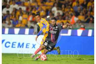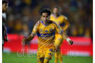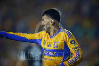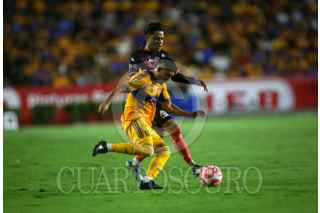 SAN NICOLÁS DE LOS GARZA, NUEVO LEÓN, 08AGOSTO2025.- Edgar López de los Tigres de la UANL, se disputa el balón con Miguel Ramírez del Puebla, en el estadio Universitario, partido correspondiente a la jornada 4 de la Apertura 2025. Marcador Final: Tigres: 7 - Puebla: 0. FOTO: GABRIELA PÉREZ MONTIEL / CUARTOSCURO.COM