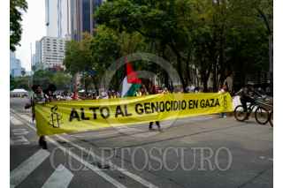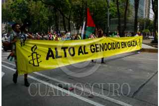 CIUDAD DE MÉXICO, 10AGOSTOO2025.- integrantes de la organización Amnistía Internacional marcharon sobre Paseo de la Reforma portando una manta con la leyenda "Alto al genocidio en Gaza" lo anterior como parte de las acciones internacionales en exigencia de un alto a fuego en el territorio palestino. FOTO: GALO CAÑAS/CUARTOSCURO.COM