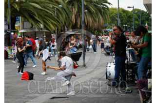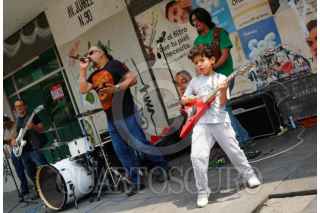 CIUDAD DE MÉXICO, 10AGOSTO2025.- Una banda de rock urbana se presentó sobre avenida Juárez con un joven guitarrista dentro de su agrupación. FOTO: GALO CAÑAS/CUARTOSCURO.COM