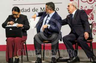 CIUDAD DE MÉXICO. 11AGOSTO2025.- Rosa Icela Rodríguez, secretaria de Gobernación, Iván Escalante, titular de la PROFECO y Pablo Gómez, titular de la Comisión Presidencial para la Reforma Electoral, en la mañanera del pueblo, en Palacio Nacional. FOTO: VICTORIA VALTIERRA/CUARTOSCURO.COM
