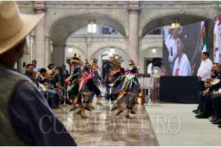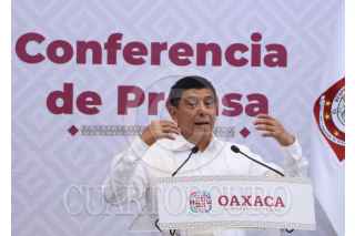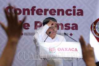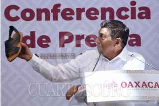 OAXACA DE JUÁREZ, OAXACA, 11 DE AGOSTO DE 2025.- Durante su conferencia semanal matutina, el gobernador de Oaxaca, Salomón Jara Cruz, acompañado por autoridades de Villa Hidalgo Yalálag, artesanos y miembros de la comunidad, anunció acciones de reparación del daño que propondrán a la marca Adidas y al diseñador Willy Chavarría por el calzado “Oaxaca Slip On”, cuya silueta se inspira en los huaraches tejidos que se elaboran desde hace más de 100 años en Yalálag. Señaló también que se trabajará para fortalecer la legislación en materia de protección del patrimonio cultural de los pueblos. FOTO: CAROLINA JIMÉNEZ MARISCAL / CUARTOSCURO.COM
