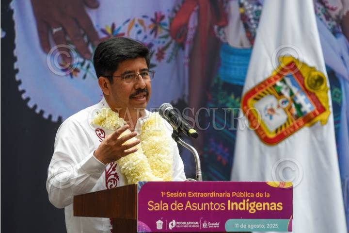 TOLUCA, ESTADO DE MÉXICO, 11AGOSTO2025.- Hugo Aguilar Ortiz Ministro Presidente electo de la SCJN durante la Primera Sesión Extraordinaria de la Sala de Asuntos Indígenas del Tribunal Superior de Justicia del Estado de México que se realizó en el Patio Constitución del Palacio del Poder Judicial del Edoméx. FOTO: CRISANTA ESPINOSA AGUILAR/CUARTOSCURO.COM