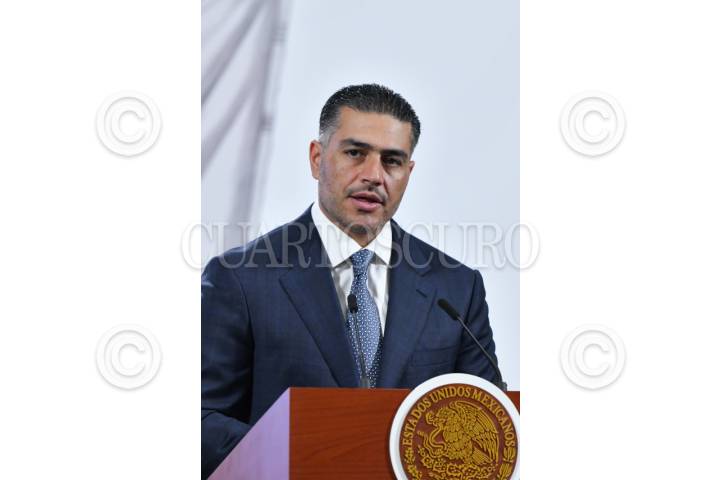 CIUDAD DE MÉXICO, 12AGOSTO2025.- Omar García Harfuch, secretario de Seguridad y Protección Ciudadana, durante su intervención en la conferencia matutina realizada en Palacio Nacional en la que se presentó el reporte de incidencia delictiva al cierre de julio de 2024 a julio de 2025 el cual indicó una reducción de 25.3% el promedio diario de víctimas de homicidio doloso a nivel nacional. FOTO: MARIO JASSO/CUARTOSCURO.COM