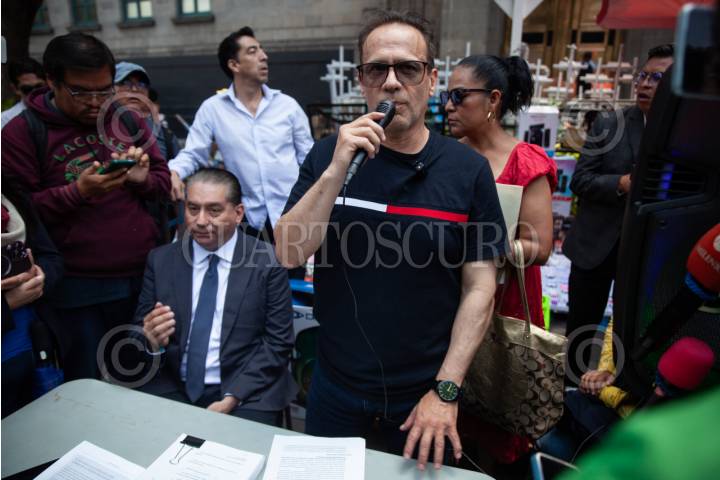 CIUDAD DE MÉXICO, 13AGOSTO2025.- Israel Vallarta acompañado de su esposa Mary Sainz ofreció conferencia de prensa frente a la Suprema Corte de Justicia de la Nación (SCJN). FOTO: ANDREA MURCIA /CUARTOSCURO.COM