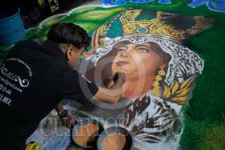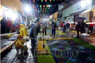 HUAMANTLA, TLAXCALA, 15AGOSTO2025.- Los tapetes monumentales de aserrín son el elemento central de "La Noche que Nadie Duerme", una tradición que se celebra cada 14 de agosto, que celebra a la Virgen de la Caridad. Estas alfombras son elaboradas a mano con aserrín teñido, flores y otros materiales naturales a fin de cubrir decenas de kilómetros de las calles por donde pasa la procesión. Su elaboración puede tardar hasta 12 horas y participan familias, colectivos y artistas locales. FOTO: MIREYA NOVO/CUARTOSCURO.COM