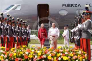 PETÉN, GUATEMALA, 15AGOSTO2024.- Claudia Sheinbaum, presidenta de México, fue recibida en el aeropuerto de Petén por Carlos Ramiro Martínez, ministro de Relaciones Exteriores de Guatemala. FOTO: PRESIDENCIA/CUARTOSCURO.COM