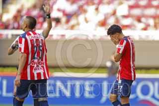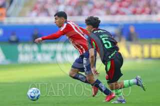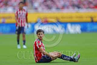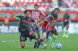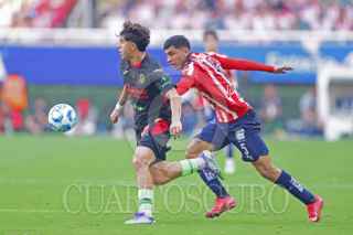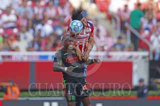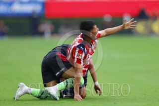 ZAPOPAN, JALISCO, 16AGOSTO2025.- Erick Gutiérrez jugador de Chivas disputa el balón con el contrario de Juárez José Rodríguez, esto en partido correspondiente jornada 5 del Torneo Apertura 2025 de la Liga MX, en donde se enfrentan los equipos de Chivas vs Juárez y en juego que se lleva a cabo en el Estadio Akron, el marcador al momento es de 2-0 a favor del equipo visitante. FOTO: FERNANDO CARRANZA GARCIA / CUARTOSCURO.COM