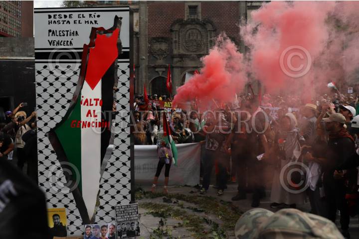 CIUDAD DE MÉXICO, 17AGOSTO2025.- La protesta pro Palestina arribó al Hemiciclo a Juárez, donde en días anteriores fue colocado un antimonumento en memoria de las personas asesinadas en Palestina. FOTO: DANIEL AUGUSTO/ CUARTOSCURO.COM