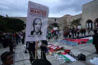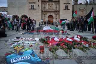 OAXACA DE JUÁREZ, OAXACA, 17AGOSTO2025.- El colectivo Oaxaca con Palestina realizó una protesta en el atrio del templo de Santo Domingo en la capital del estado para exigir alto al genocidio en ese país, además de pedir al gobierno federal de Claudia Sheinbaum romper relaciones con Israel; a esta acción se sumaron decenas de personas que prendieron veladoras y gritaron consignas. FOTO: CAROLINA JIMÉNEZ MARISCAL/CUARTOCURO.COM