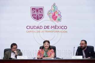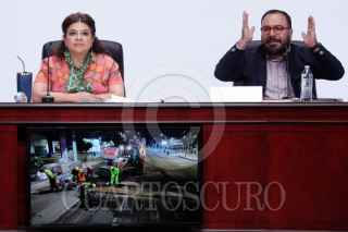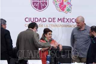 CIUDAD DE MÉXICO, 18AGOSTO2025.- Héctor Ulises García Nieto, secretario de Movilidad de la Ciudad de México; César Cravioto, secretario de gobierno de la ciudad; Clara Brugada, jefa de gobierno, José Mario Esparza, secretario de Gestión Integral del Agua, y Raúl Basulto Luviano, secretario de Obras y Servicios capitalino, conversan tras la conferencia en que anunciaron el inicio del “Programa Integral de Bacheo” en las principales vialidades de la capital. FOTO: GALO CAÑAS/CUARTOSCURO.COM