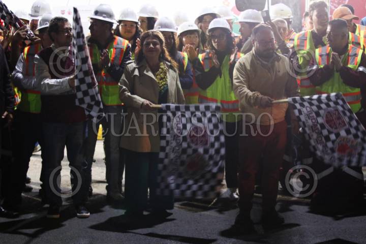 CIUDAD DE MÉXICO, 19AGOSTO2025.- Clara Brugada, jefa de Gobierno, dio el banderazo de salida del Programa Integral de Mantenimiento de la Carpeta Asfáltica, realizado en Eje 3, canal de Apatlaco. FOTO: GRACIELA LÓPEZ/CUARTOSCURO.COM