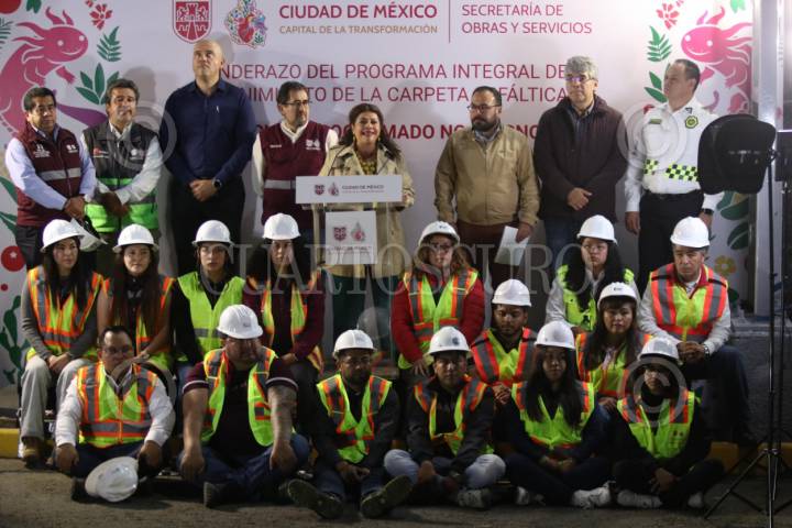 CIUDAD DE MÉXICO, 19AGOSTO2025.- Clara Brugada, jefa de Gobierno, acompañada de autoridades y trabajadores de obras durante el banderazo de salida del Programa Integral de Mantenimiento de la Carpeta Asfáltica, realizado en Eje 3, canal de Apatlaco. FOTO: GRACIELA LÓPEZ/CUARTOSCURO.COM