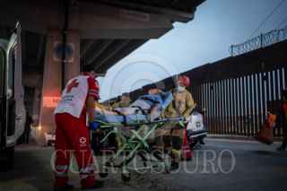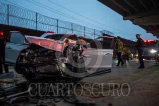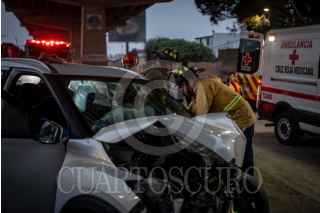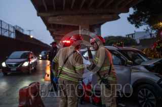 TIJUANA BAJA CALIFORNIA 20AGOSTO2025.- Fuerte accidente vehicular se registró en la avenida Internacional dejando el saldo de dos mujeres de la tercera edad lesionadas. El vehículo en el que viajaban, un Nissan Kicks color blanco, quedó impactado contra una de las estructuras de concreto del viaducto elevado. Paramédicos de la Cruz Roja llegaron al lugar para atender el siniestro. Ambas mujeres sufrieron fracturas como consecuencia del impacto por lo que fueron trasladadas a un hospital cercano. El percance registrado la mañana de este miércoles, generó congestionamiento vehicular en la zona, mientras autoridades realizaban el peritaje correspondiente y retiraban la unidad accidentada. FOTO: CHRIS NOYOLA/ CUARTOSCURO.COM