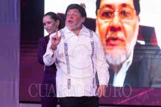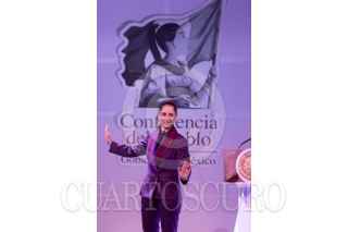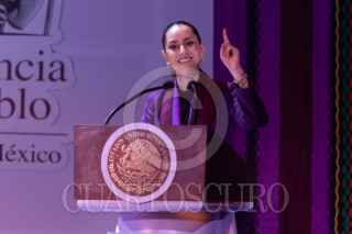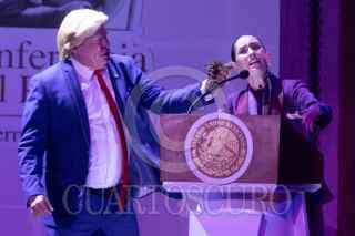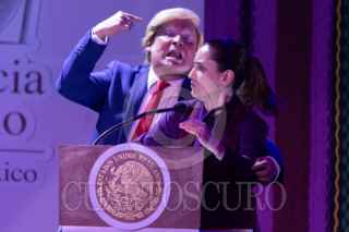 CIUDAD DE MÉXICO, 20AGOSTO2025. Tamara Henaine (nieta de Capulina) interpreta a Claudita Sheinbaum durante su actuación en la obra de sátira política "La risa mañanera", que se presenta en el Teatro Sogem Wilberto Cantón. FOTO: EDGAR NEGRETE LIRA/CUARTOSCURO.COM