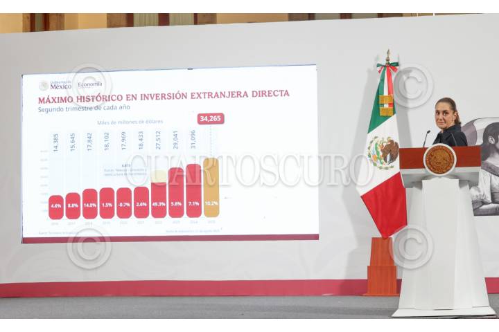 CIUDAD DE MÉXICO, 21AGOSTO2025.- Claudia Sheinbaum Pardo, Presidenta de México, destacó que este año el país alcanzó su máximo histórico de inversión extranjera directa, al iniciar la Mañanera del Pueblo en Palacio Nacional. FOTO: MOISÉS PABLO/CUARTOSCURO.COM