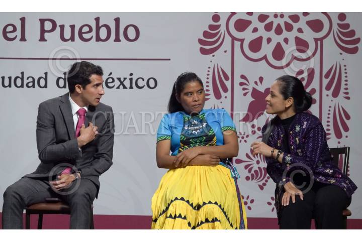CIUDAD DE MÉXICO 22AGOSTO2025.- Romel Pacheco, titular de la CONADE , María Lorena Ramírez, corredora Rarámuri Ultramarotonista y Marina Beatriz, Atleta y líder de México Imparable, durante laConferencia del Pueblo, en donde se dieron los pormenores del programa "México Imparable" en cuál promueve el deporte en pueblos indígenas FOTO:ROGELIO MORALES /CUARTOSCURO.COM