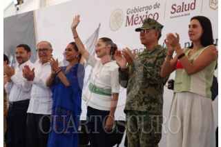 ACAPULCO, GUERRERO, 22AGOSTO2025.- Martí Batres, director del ISSSTE; David Kershenobich, secretario de Salud, Evelyn Salgado Pineda, gobernadora de Guerrero, y Claudia Sheinbaum Pardo, presidenta de México; durante la inauguración del Hospital Regional de Alta Especialidad ISSSTE, primera etapa. FOTO: PRESIDENCIA/CUARTOSCURO.COM