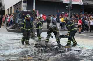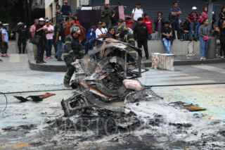CIUDAD DE MÉXICO, 27AGOSTO2025.- Bomberos limpian los rezagos de muebles que fueron quemados por habitantes del edificio número 11 de la calle República de Cuba en el Centro Histórico en donde exigieron justicia por el desalojo que fueron afectados alrededor de 10 familias esta mañana. En la imágen, retiran las cenizas que quedaron en la calle. FOTO: GRACIELA LÓPEZ/CUARTOSCURO.COM