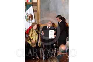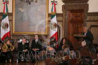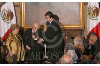 México D.F., a 21 de Noviembre de 2007.- El creador de la la historieta La Familia Burron, Gabriel Vargas recibio un reconocimiento en el salon de cabildos del H. Ayuntamiento de la Ciudad, de manos del jefe del Gobierno de la Ciudad Marcelo Ebrard Casaubon. FOTO: VICTORIA VALTIERRA/CUARTOSCURO.COM