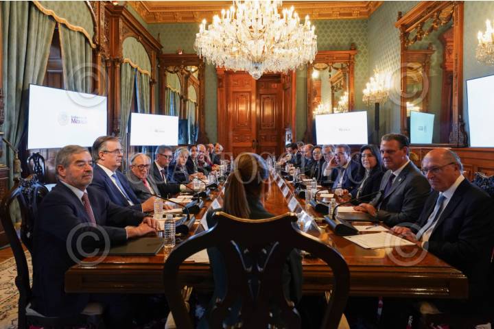 CIUDAD DE MÉXICO, 28AGOSTO2025.- Claudia Sheinbaum Pardo, Presidenta de México, sostuvo una reunión Geraldo Alckmin, Vicepresidente de Brasil. La mandataria mexicana destacó las reuniones que sostuvo la delegación carioca con integrantes de su gabinete y con empresario mexicanos, esto con el objetivo de fortalecer la cooperación en desarrollo científico, económico y ambiental. El encuentro se realizo en Palacio Nacional, y también estuvieron presentes Juan Ramón de la Fuente, titular de la SRE, y Marcelo Ebrard, secretario de Economía. FOTO: PRESIDENCIA/CUARTOSCURO.COM