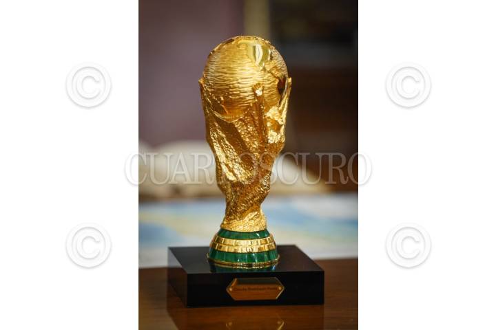 CIUDAD DE MÉXICO, 28AGOSTO2025.- Claudia Sheinbaum Pardo, Presidenta de México, se reunió con Gianni Infantino, presidente de la FIFA, para hablar sobre los preparativos de la próxima Copa Mundial de Fútbol, cuyo partido inaugural se jugará en el Estadio Azteca. En la imagen, una replica del trofeo oficial. FOTO: PRESIDENCIA/CUARTOSCURO.COM