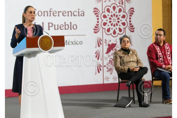 CIUDAD DE MÉXICO. 29AGOSTO2025.- La primera mandataria del país, Claudia Sheinbaum Pardo en la Mañanera del Pueblo, en Palacio Nacional acompañada de Raquel Buenrostro y Bulmaro Juárez. FOTO: VICTORIA VALTIERRA/CUARTOSCURO.COM