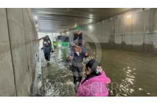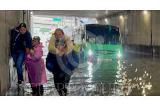 CIUDAD DE MÉXICO, 02SEPTIEMBRE2025.- Elementos de la Secretaria de Seguridad Ciudadana (SSC) auxiliaron a 63 pasajeros que habían quedado atrapados dentro de un camión de transporte público tras inundarse por las intensas lluvias registradas esta mañana. El incidente se registró en el bajo puente de Río Churubusco y Eje 1. FOTO: SSC/CUARTOSCURO.COM