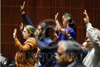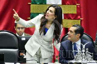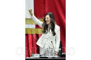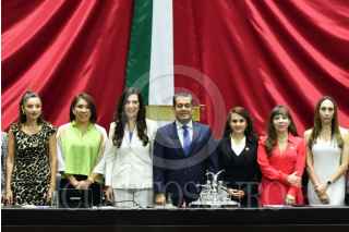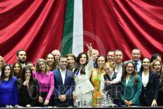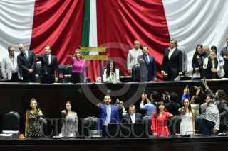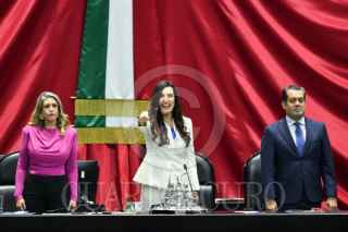 CIUDAD DE MÉXICO, 02SEPTIEMBRE2025.- Kenia López, nueva diputada presidenta de l cámara baja, toma protesta durante la sesión preparatoria de la Cámara de Diputados en la que se instaló la nueva mesa directiva para el Primer Periodo de Sesiones Ordinarias del segundo año de ejercicio de LXVI Legislatura. La acompañan los ahora vicepresidentes: Paulina Rubio Fernández y Sergio Gutiérrez Luna. FOTO: MARIO JASSO/CUARTOSCURO.COM