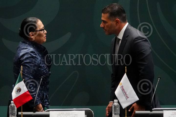 CIUDAD DE MÉXICO, 02SEPTIEMBRE2025.- Rosa Icela Rodríguez, secretaría de Gobernación, y Omar García Harfuch, secretario de Seguridad Pública y Protección Ciudadana, durante la instalación de la 51ª Sesión Ordinaria del Consejo Nacional de Seguridad en Palacio Nacional a la que acudieron las y los gobernadores de los 32 estados de la República. FOTO: GALO CAÑAS/CUARTOSCURO.COM
