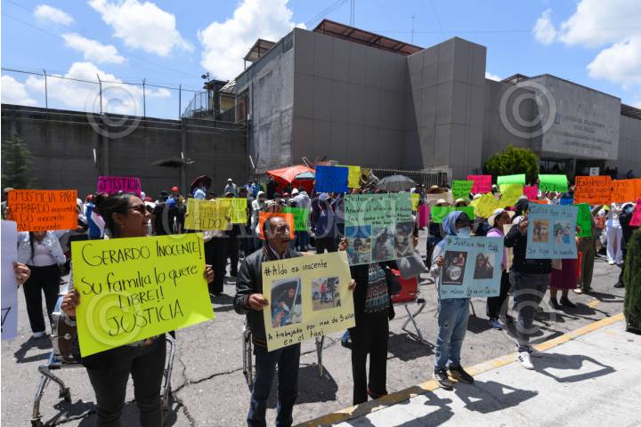 ALMOLOYA DE JUÁREZ, ESTADO DE MÉXICO, 03SEPTIEMBRE2025.- Familiares, amigos y compañeros de Aldo, Iván y Gerardo se manifestaron al ritmo de la tambora en las inmediaciones de los Juzgados de Control de Almoloya de Juárez; acusados por extorsión sus familiares piden justicia. Originarios de este municipio, trabajan en choferes de taxis y músicos, sus conocidos exigen su libertad. FOTO: CRISANTA ESPINOSA AGUILAR/CUARTOSCURO.COM